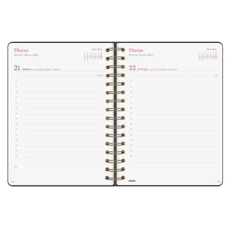 Agenda de espiral de tapa dura de cartón forrado con peliculado mate antirrayaduras. Diseño elegante y sofisticado con detalles estampados metalizados. Ideal para uso personal y/o profesional. Con goma elástica y esquinas microperforadas para localizar rápidamente el día/semana en curso. Incorpora un set de adhesivos temáticos. El diseño interior es limpio y fácil, con espacio suficiente para organizar tus proyectos, tareas y compromisos. Contiene información de interés en la anualidad y otros contenidos extra orientados a la organización personal.