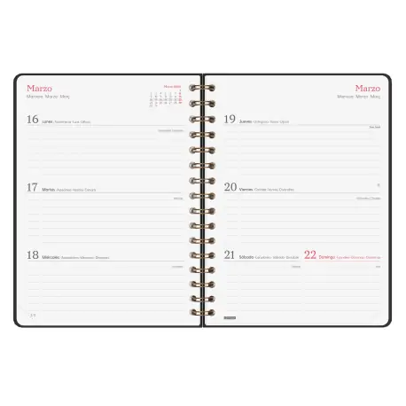 Agenda de espiral de tapa dura de cartón forrado con peliculado mate antirrayaduras. Diseño elegante y sofisticado con detalles estampados metalizados. Ideal para uso personal y/o profesional. Con goma elástica y esquinas microperforadas para localizar rápidamente el día/semana en curso. Incorpora un set de adhesivos temáticos. El diseño interior es limpio y fácil, con espacio suficiente para organizar tus proyectos, tareas y compromisos. Contiene información de interés en la anualidad y otros contenidos extra orientados a la organización personal.