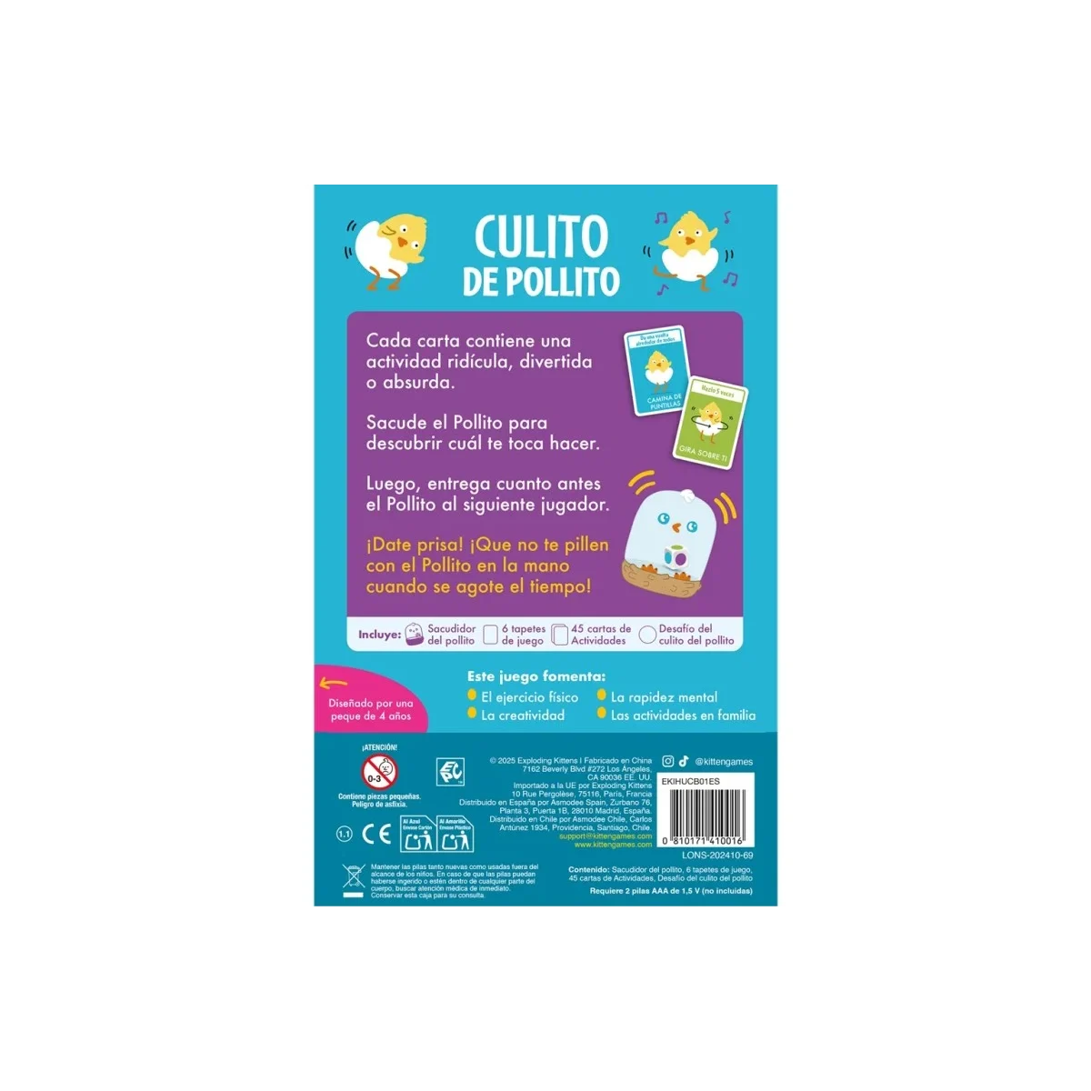 Este juego es perfecto para disfrutar en familia o con amistades, ya que fomenta la creatividad, el ejercicio físico y la rapidez de reacción. Además, sus partidas rápidas lo convierten en una opción genial para animar cualquier reunión. Con un diseño colorido, reglas sencillas y actividades absurdas y graciosas, Culito de Pollito se convierte en un imprescindible para niñas, niños y mayores que quieran vivir un rato de diversión sin complicaciones.