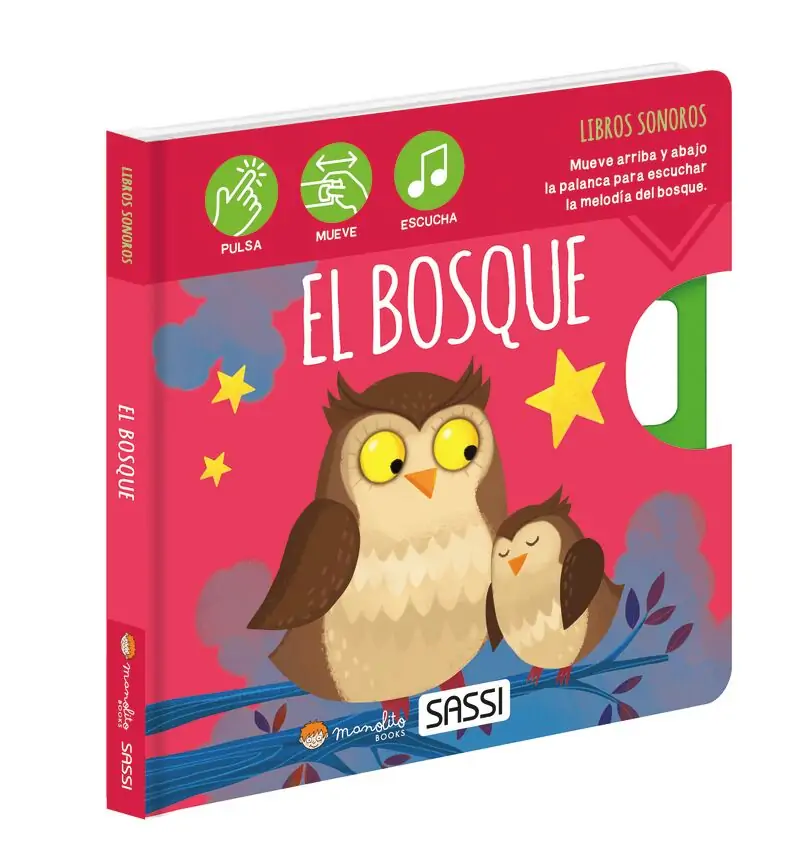 Aquí están los animalitos del bosque. Lee sus aventuras, pulsa los botones y aprende a reconocer sus gritos. Tira y empuja de la manivela: una dulce melodía acompañará tu lectura. Un libro sonoro para aprender a asociar imágenes con sonidos y estimular el aprendizaje.