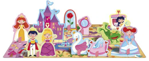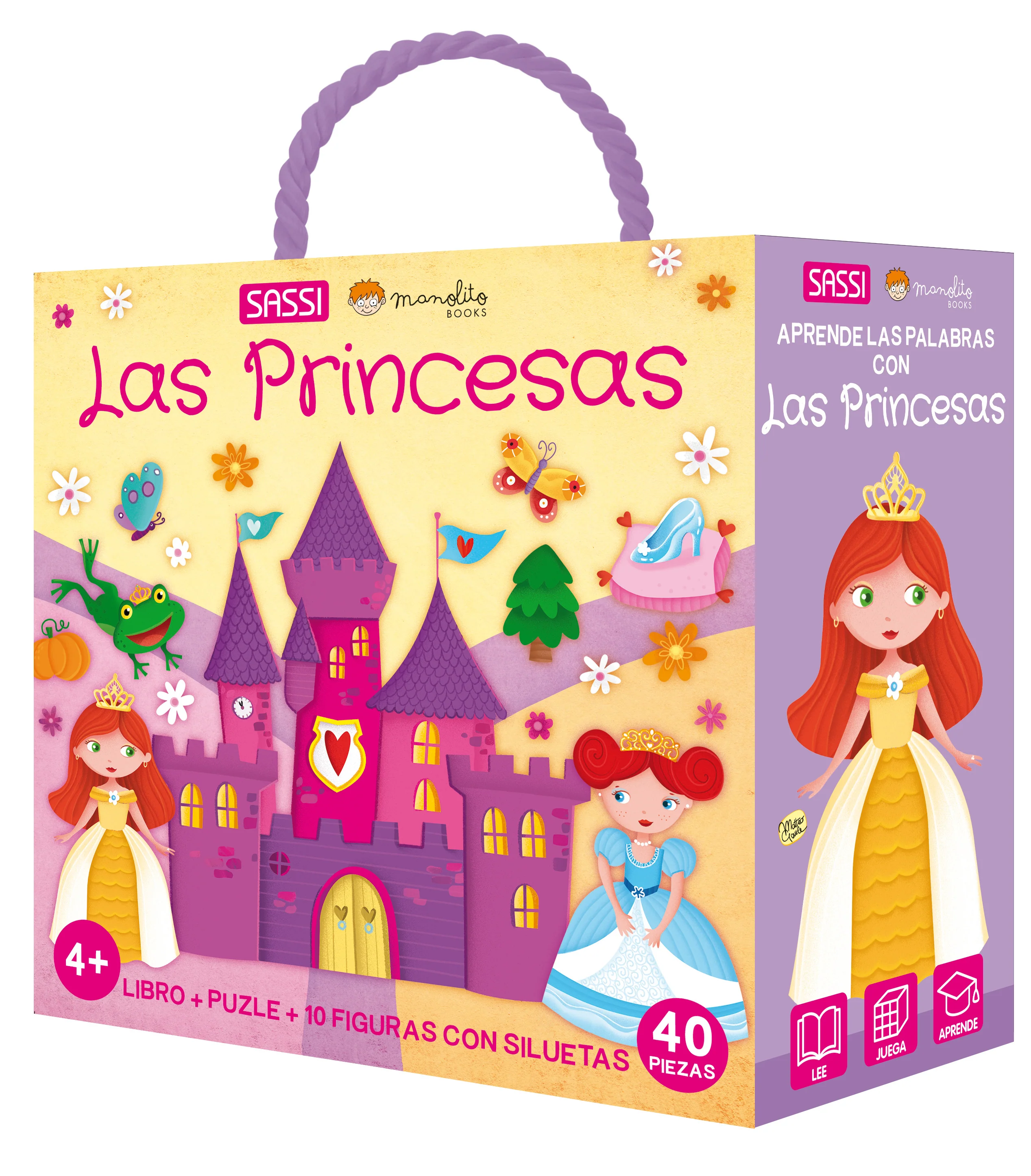 Una caja adornada con detalles iridiscentes contiene un libro de 10 páginas, un puzle de 40 piezas y 10 figuras silueteadas del mundo de las princesas para montar y colocar en el puzle, para aprender a reconocer y asociar elementos y palabras.